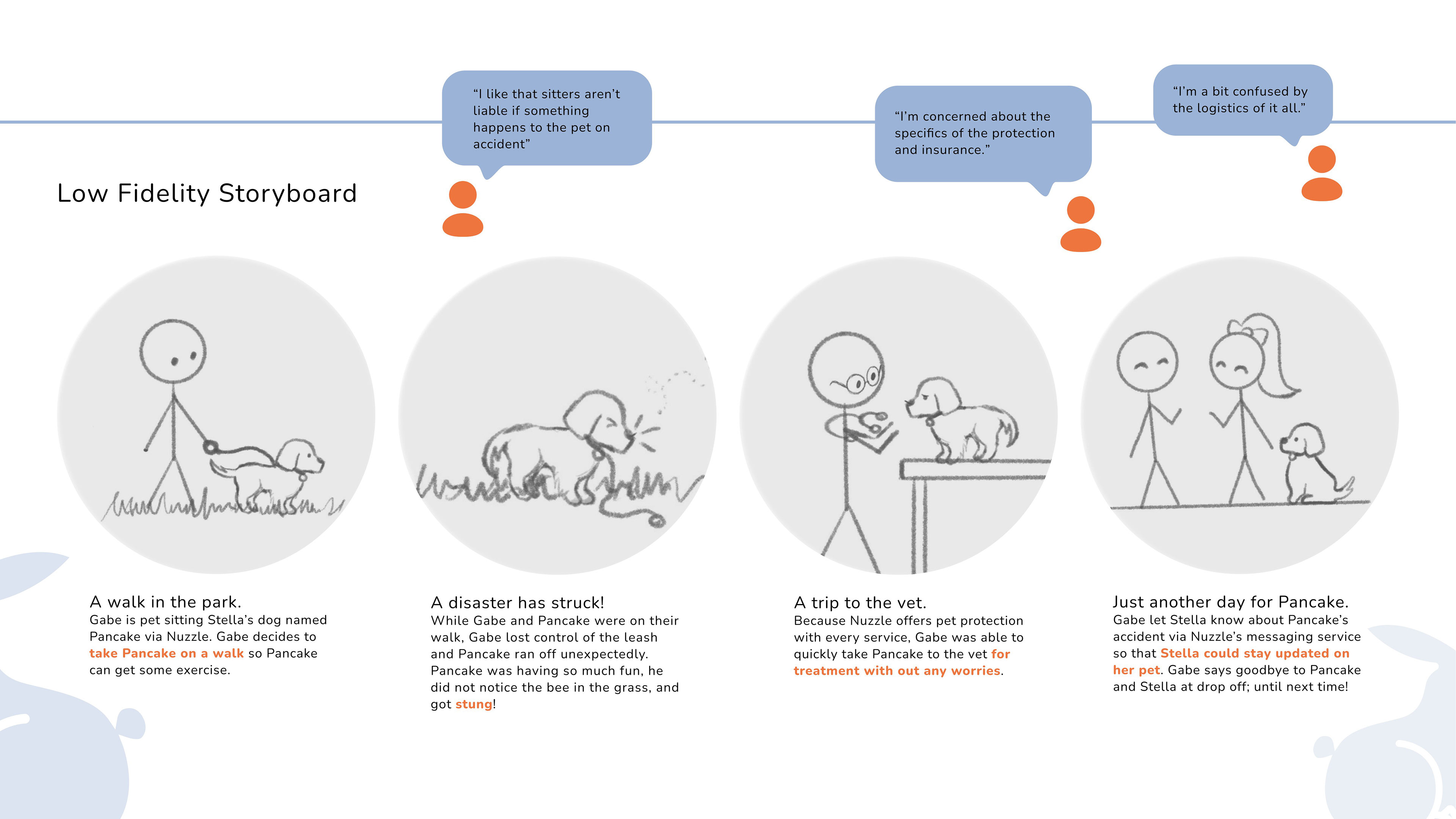 In a UI/UX group project with two of my peers, we created Nuzzle, a pet sitting app that addresses trust and liability issues through transparency and open communication between pet owners and sitters. Throughout the project, we conducted many interviews with a wide range of people and utilized the feedback we got to guide our design decisions. Using storyboards, we developed the app's flow from the perspectives of pet owner Stella and pet sitter Gabe.